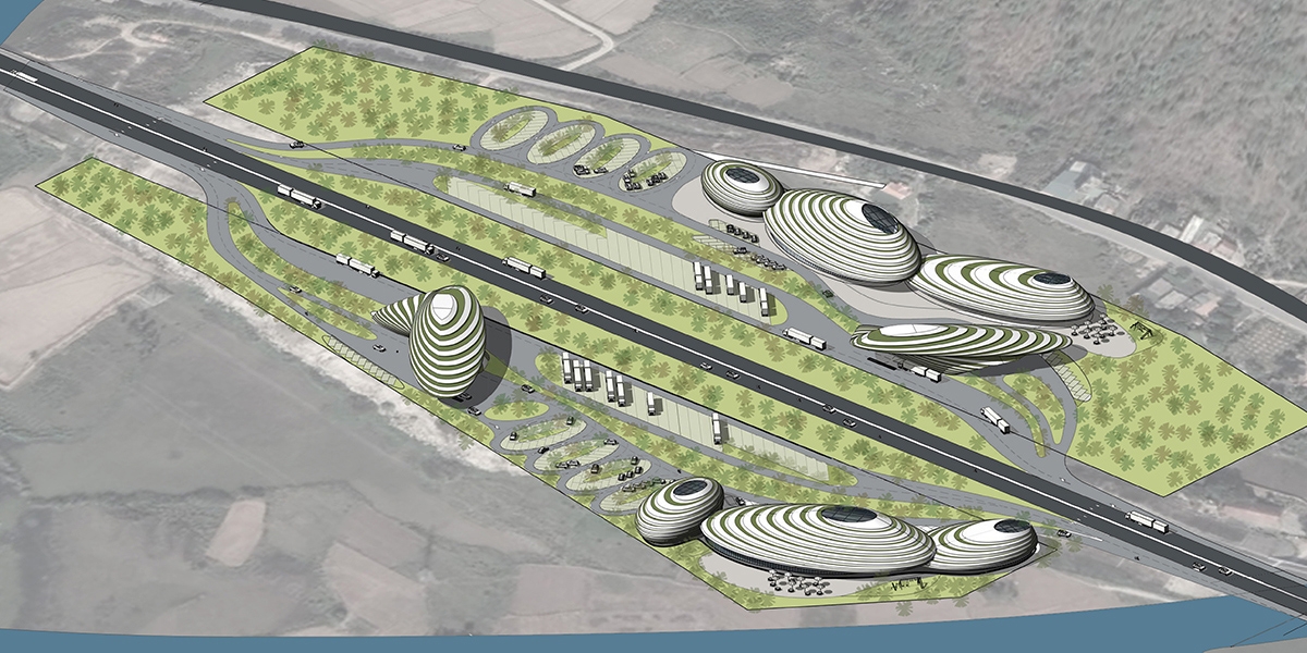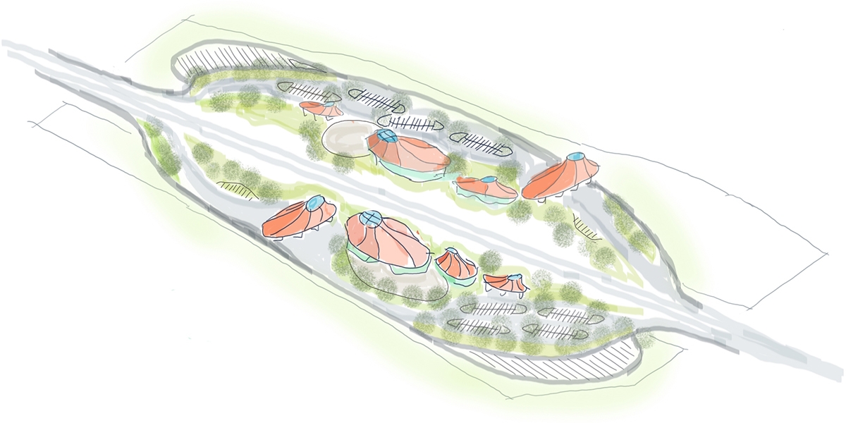 The project was the design of three Freeway Rest Stops along the route between Mong Cai and Ha Long in the north of Vietnam. This rest stop, around 20 km outside of Ha Long, reflects the surrounding hilly landscape. Clusters of egg-shaped volumes, each with an oculus skylight, are arranged on both sides of the highway. The hill-eggs are sliced horizontally to create green roof planters, and to let in more light to the convenience store and restaurants below. The oval shapes are carried through in the parking layout. The design is a remarkable event - whether you stop or not - along this route.